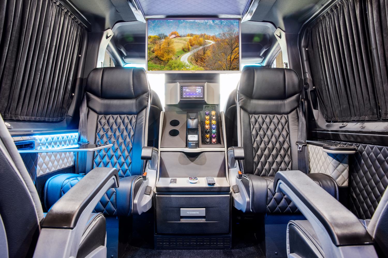 Sit back and relax in your captain chair in all of it’s comfort and glory. Every feature inside our vehicles are controlled through our infotainment system designed and integrated to the maximum user - efficiency possible in any vehicle on the road. With a minimum of 3 touches you can make yourself a cup of coffee and watch the news.